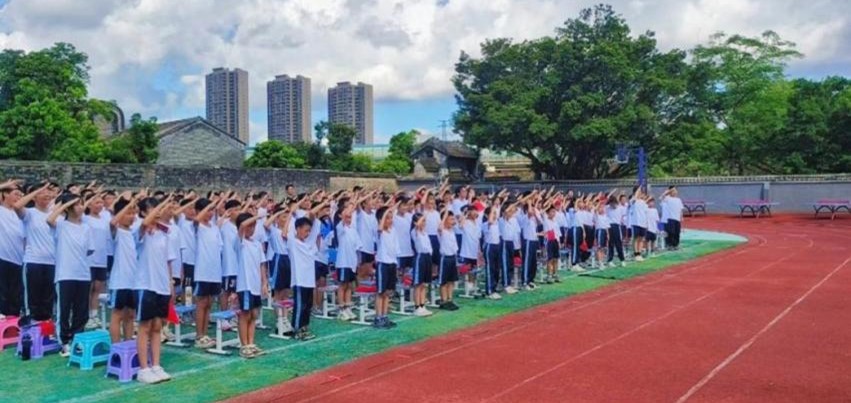 升旗台前,师生们站立于蓝天之下,国旗在雄壮的国歌声中冉冉升起,在空中编织起红与蓝的交织,师生们心怀崇敬,共同见证这庄严时刻。